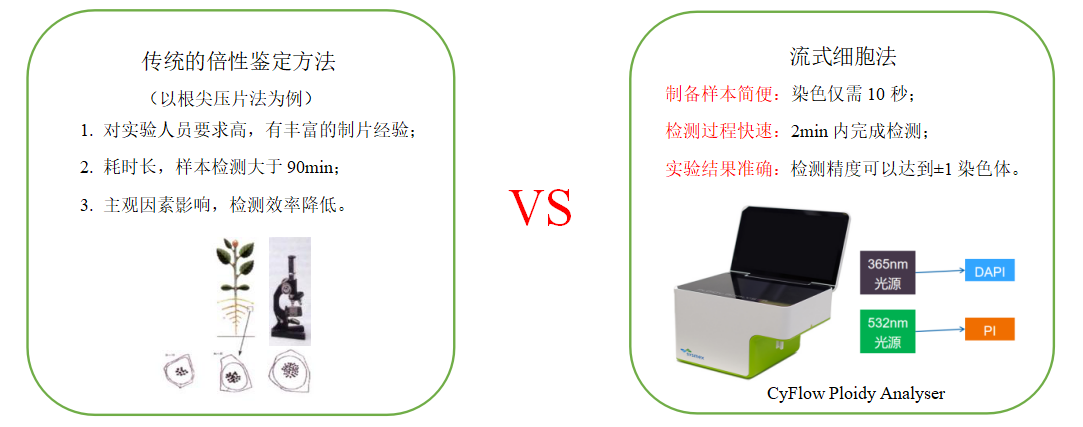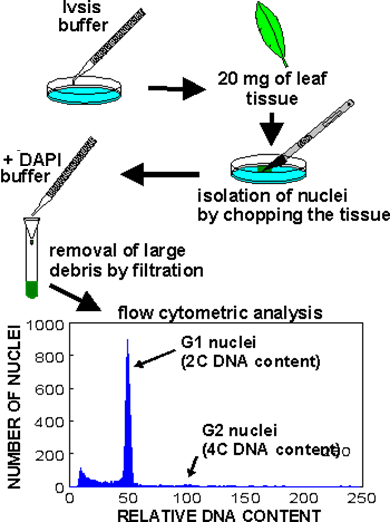 傳統(tǒng)的倍性鑒定主要采用常規(guī)壓片法統(tǒng)計染色體數(shù)目,但采用這種方法很難尋找到分裂中期染色體分散良好并可進行計數(shù)的細胞,而且整個過程耗時長,檢測效率低。采用流式細胞術(shù)(Flow Cytometry,F(xiàn)CM)進行倍性分析的方法簡化了倍性分析的過程,可以快速準(zhǔn)確檢測同一物種范圍內(nèi)不同倍性的樣品。FCM作為一項快速、高效的檢測技術(shù),被廣泛應(yīng)用于細胞分類學(xué)、植物遺傳學(xué)及植物生理學(xué)等研究領(lǐng)域中。FCM常被用于鑒定植物倍性水平,通過檢測植株G0/G1峰的細胞核DNA含量可以判斷出植物的倍性。