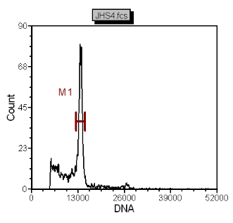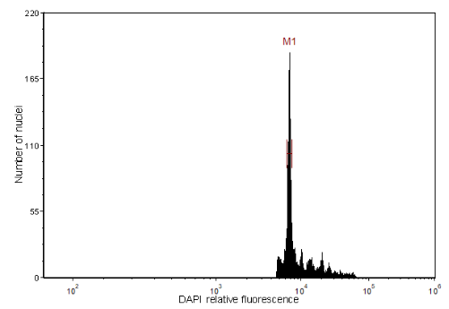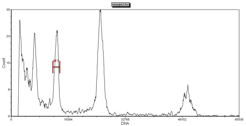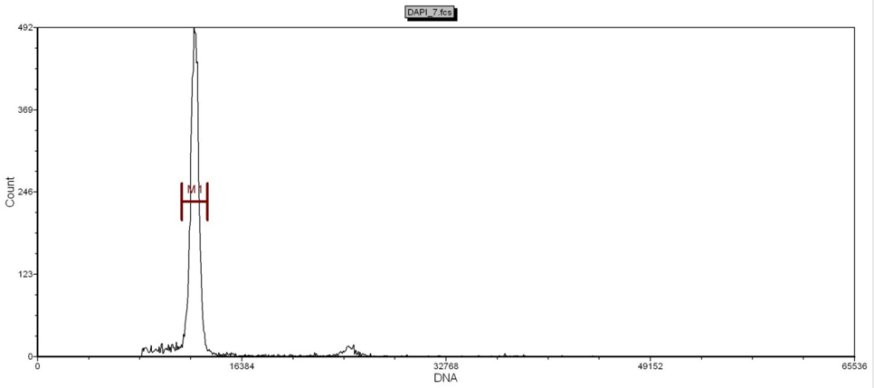 首先需要裂解液將組織中細胞核釋放出來,并打開DNA鏈,然后用DAPI染液將細胞核DNA上的A-T堿基對特異性染色,再用儀器檢測出被染色的A-T堿基對發(fā)出的熒光強度。比如二倍體的熒光強度是100(橫坐標(biāo)),那么單倍體的熒光強度就是50(橫坐標(biāo))??v坐標(biāo)是細胞數(shù)量的顯示,通常來說,信號峰高說明信號比較好,雜質(zhì)少。